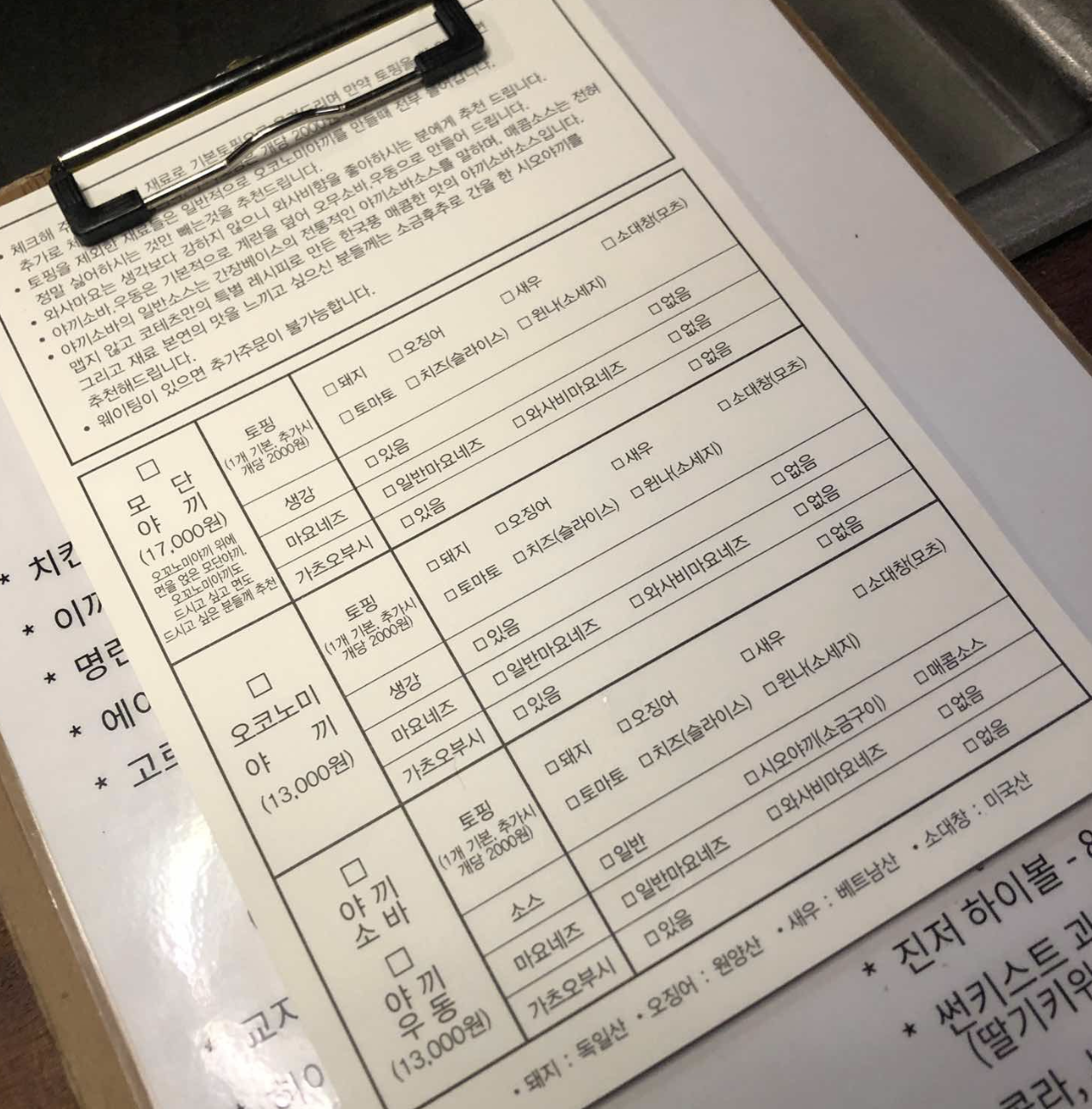 야끼의 종류도 우리가 선택할 수 있고, 그위에 올려져있는 토핑을 비롯한 각종 옵션들을 우리가 선택할 수 있다.